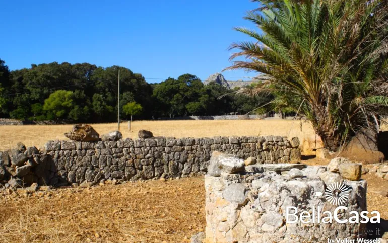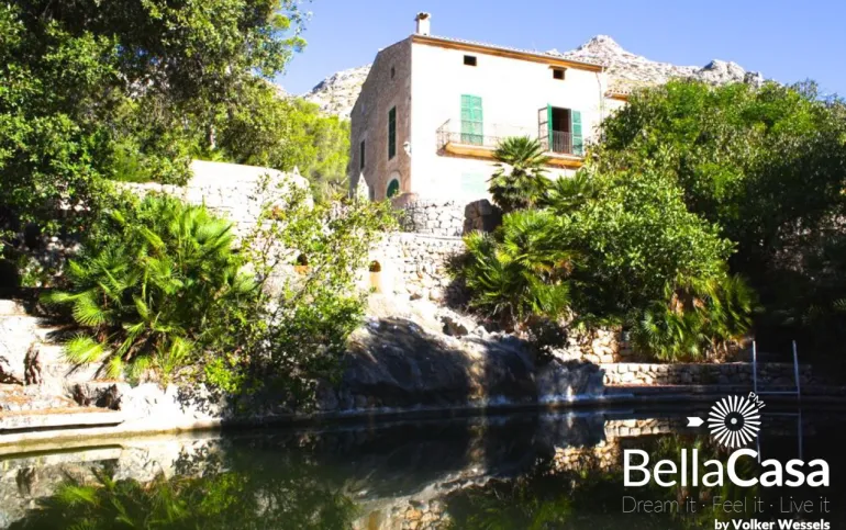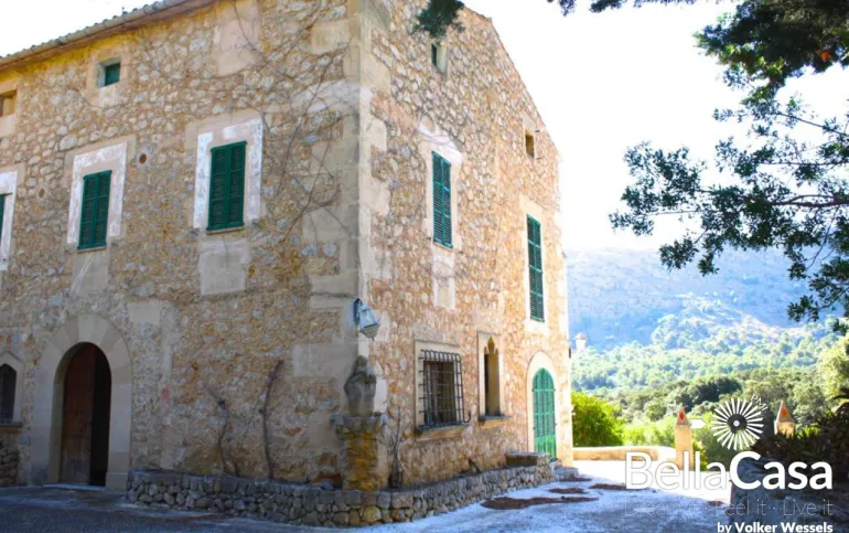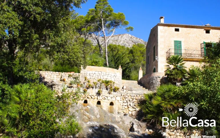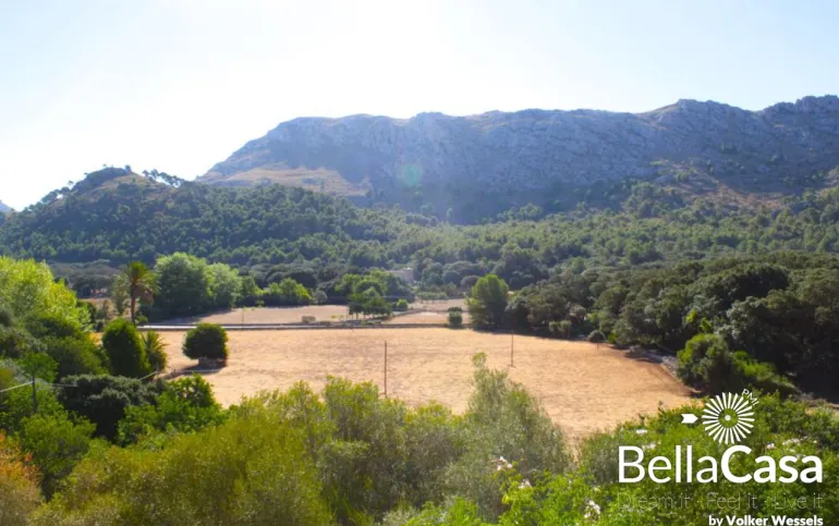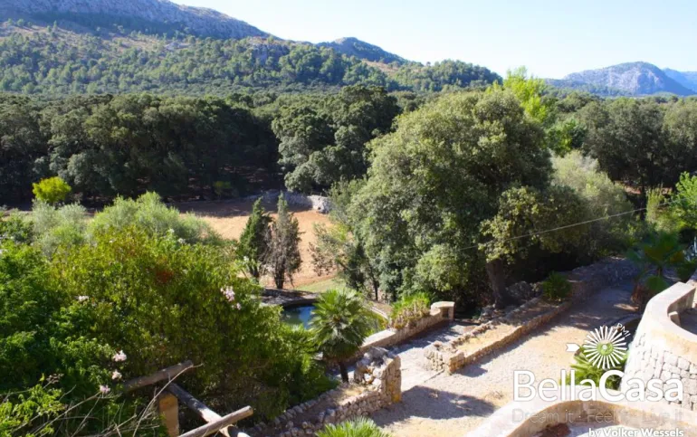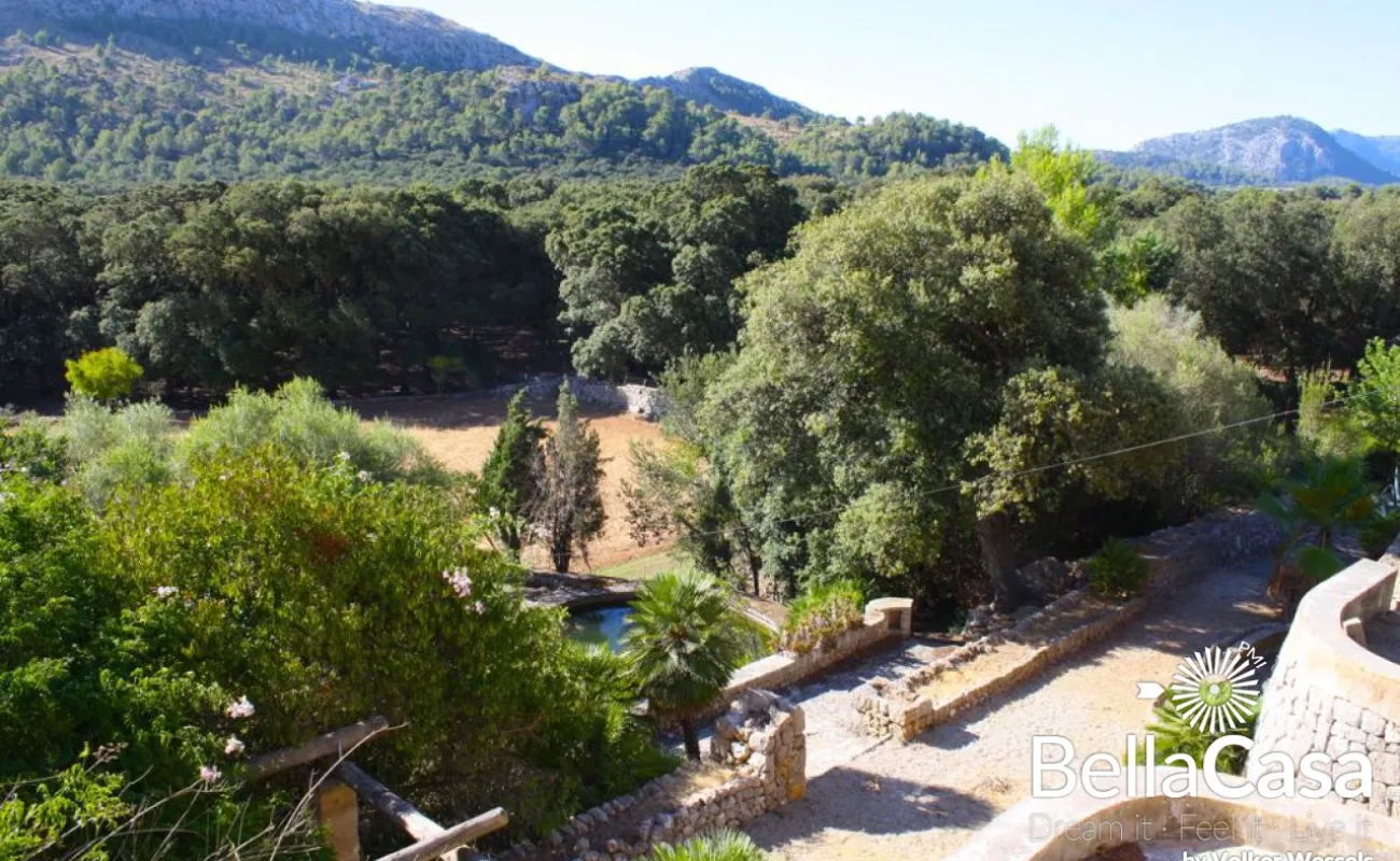 Das historische 244 ha Besitztum liegt ambitioniert nahe der Cala San Vicente und Pto. Pollenca in verwunschener Tallage. Blickfang ist das Posesion aus dem 13. Jh., das aus einem alten Wehrturm hervorging. Lassen Sie sich von der weitläufigen Gartenanlage mit Eichenwaldallee verzaubern und genießen den entspannenden Panoramablick vom antiken 60 m2 Landschaftspool und von allen Ebenen des Anwesens. Ein eigener, mit Tramuntanawasser gespeister Brunnen und ein antikes Becken zur Olivenproduktion, bereichern das Ambiente. 1989 wurde im Fels des Besitztums eine Höhle aus dem Bronzezeitalter entdeckt und die alten Kalkhöhlen werden von einem Fluß, der im Winter Wasser führt, gespeist. Ein Teil des Anwesens umfasst das von der UNESCO zum Weltnaturerbe erklärte Tramuntana Gebirge.