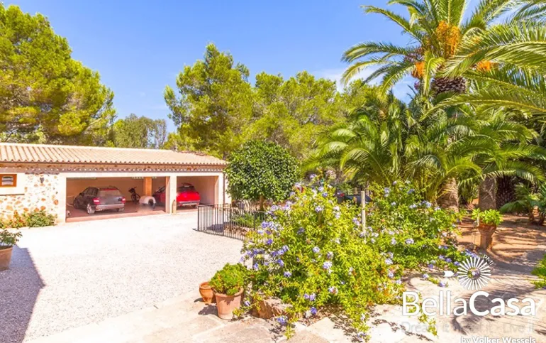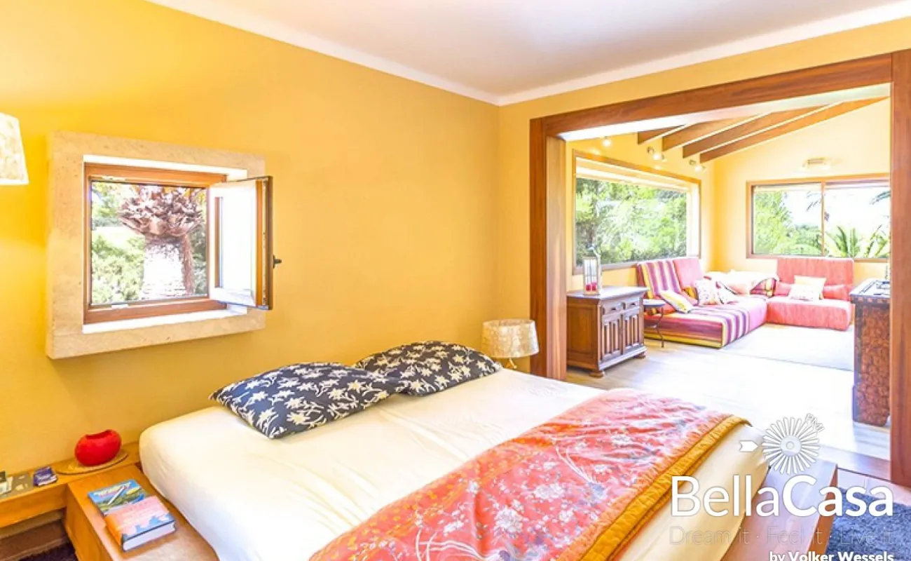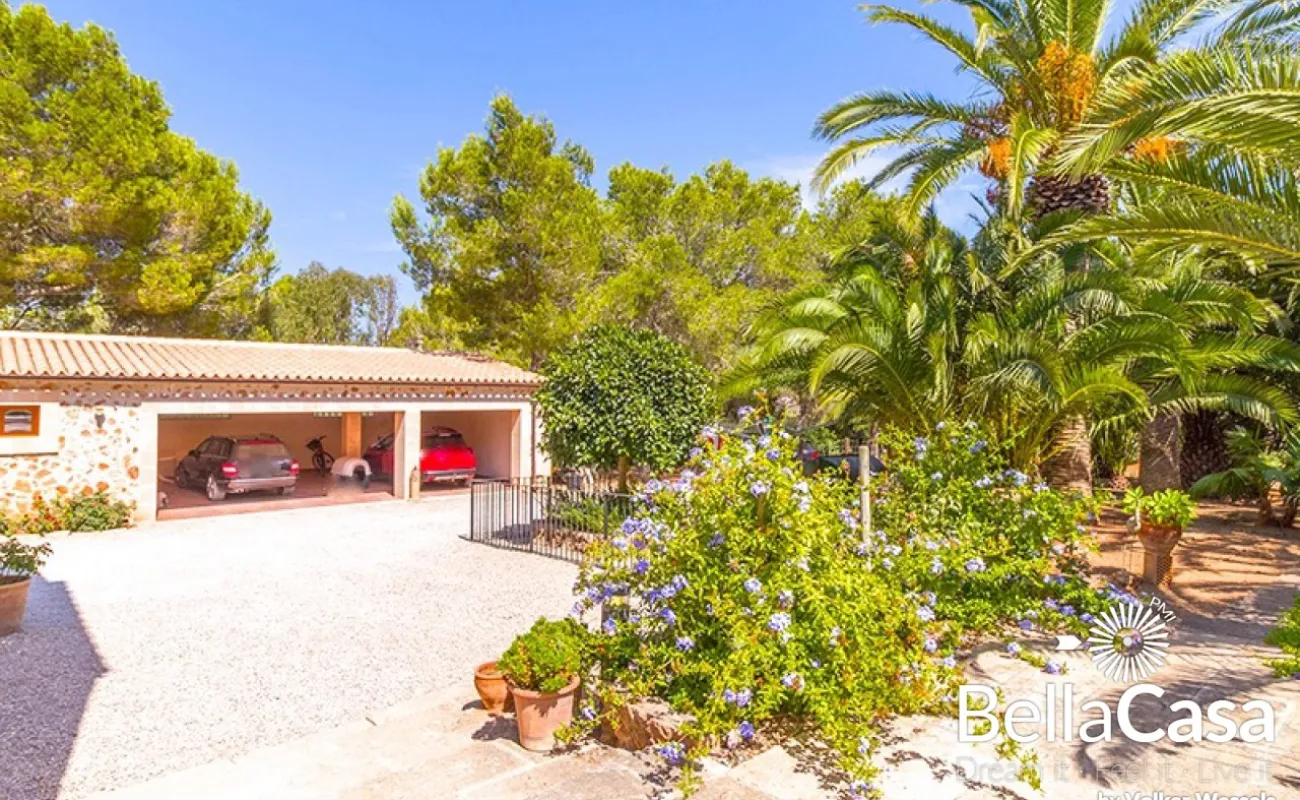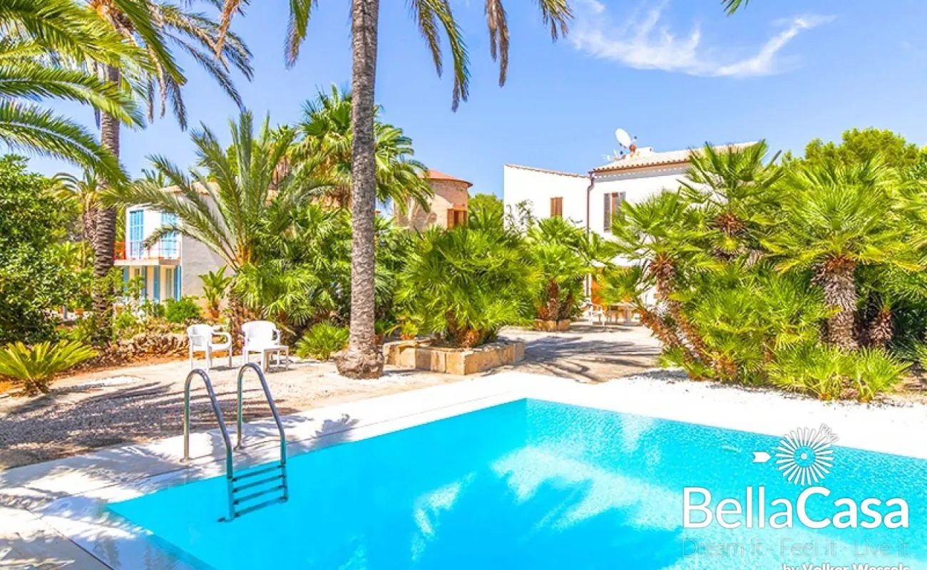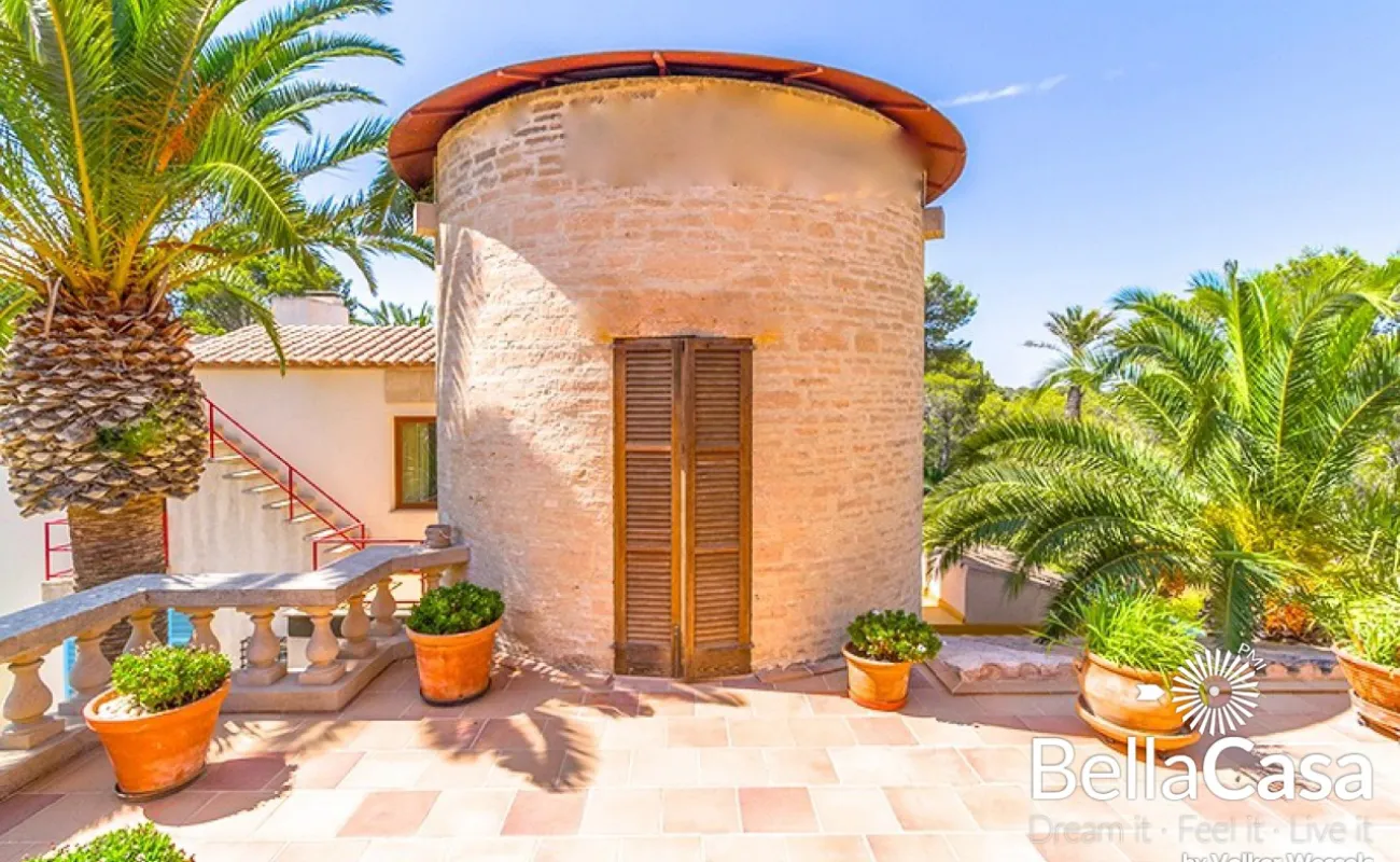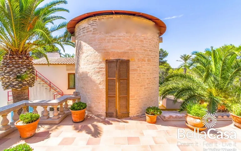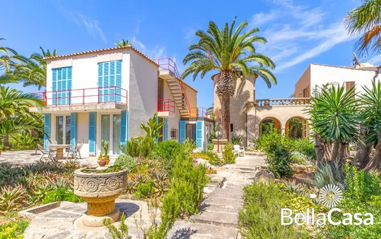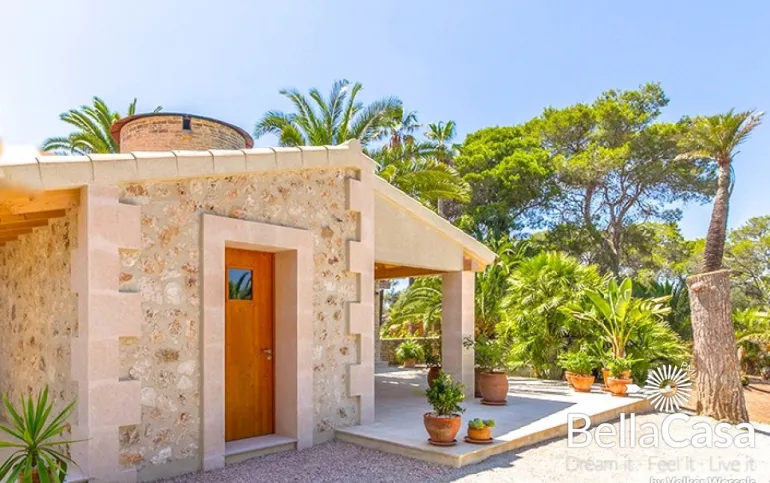 This luxurious, palm-lined tower finca, close to the natural beach Es Trenc, offers 5 bedrooms, 5 bathrooms, guest toilet, lounge, fireplace, air conditioning, oil central heating, garage, private well, roof terrace with sea view and a wonderful 12 x 6 m infinity pool with spacious sun terraces. In the immediate vicinity you find the villages of Colonia de Sant Jordi, Covetes and the fisher village of Sa Rapita with its marina and the adjacent natural beach Es Trenc. Due to the current expansion of the motorway, you can reach the island metropolis of Palma with its International airport in 25 minutes. The property was renovated in 2015.