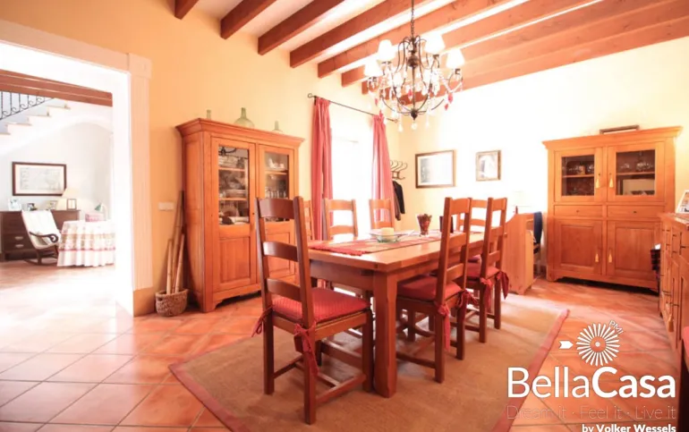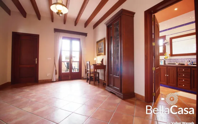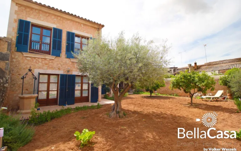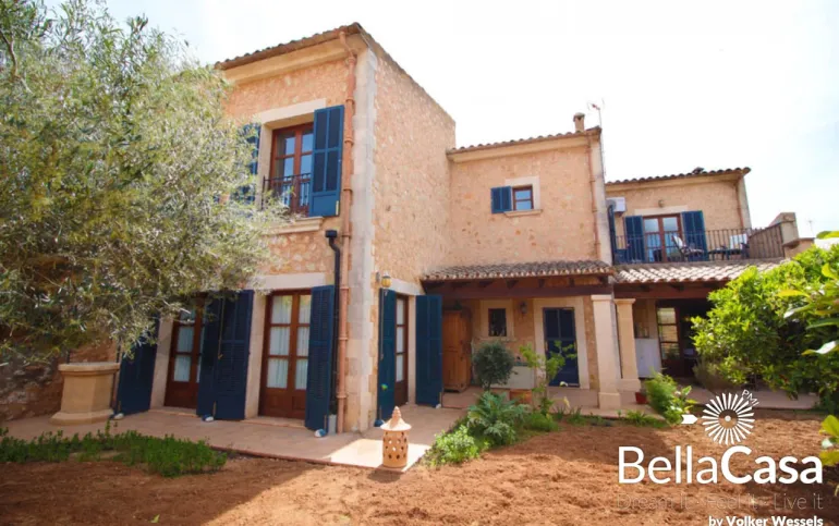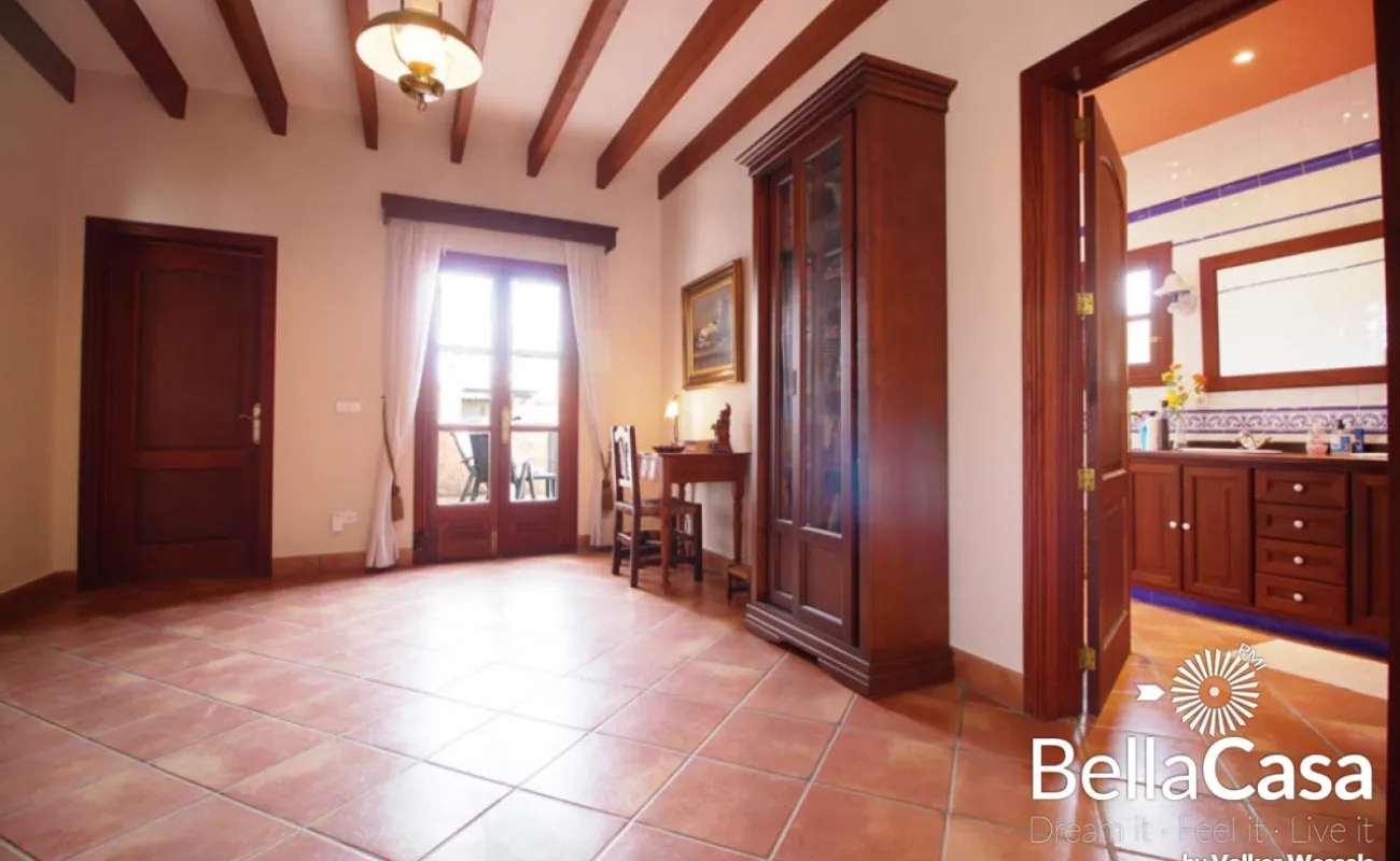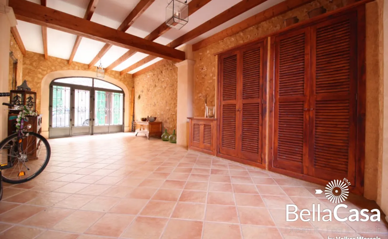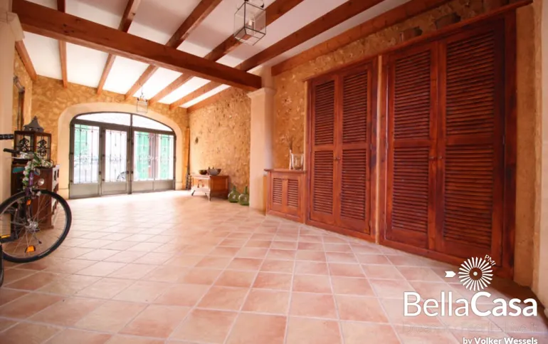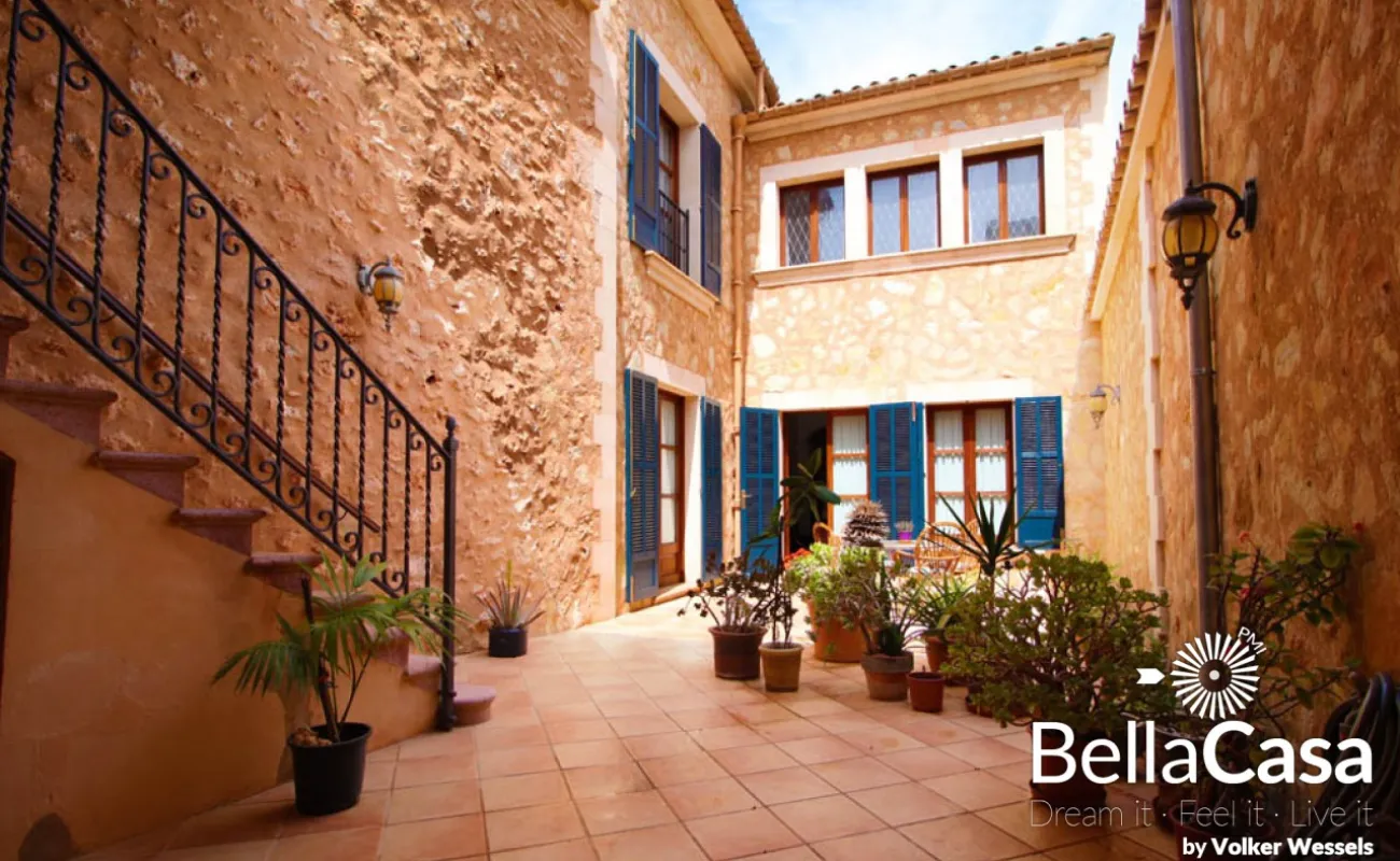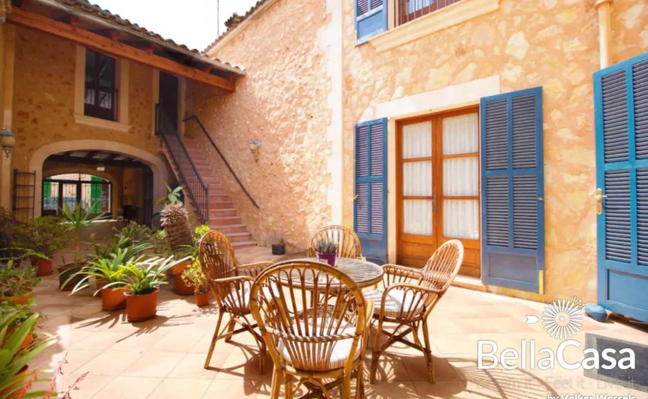 This luxurious and architecturally attractive town house exudes its charm from a mixture of manor house and finca style. It offers an idyllic tranquility not far from the center of Campos and has a spacious entrance, 5 bedrooms (one of which is in the guest wing, which can also be used as a large office), 2 bathrooms, toilet, large kitchen, living room, dining room, 50 m2 loft, underfloor heating throughout the house, fireplace, double garage, balcony, terrace and an imposing 230 m2 garden patio with its own well. The property is originally more than 200 years old and was refurbished to a high quality in 2000, using elements made of ceramic, Santanyi stone, teak and wrought iron. Enjoy maximum living comfort in the heart of the up-and-coming Mallorcan village of Campos, with its abundance of supermarkets and cozy restaurants and bars. You can reach the island metropolis of Palma with its International airport in 20 minutes and the well-known natural beach Es Trenc in just 10 minutes.